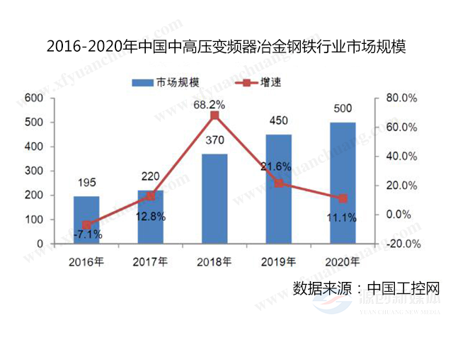 中高壓變頻器在冶金鋼鐵行業(yè)的應(yīng)用分為前端和后端二部分。前端主要用于燒結(jié)主抽風(fēng)機(jī)、煉鐵環(huán)節(jié)引風(fēng)機(jī)、循環(huán)風(fēng)機(jī)、高爐風(fēng)機(jī)等;后端主要有板材和線材的軋機(jī)、卷取機(jī)、風(fēng)機(jī)、料漿泵等,主要以電機(jī)節(jié)能為目的。2020年冶金鋼鐵行業(yè)中高壓通用變頻器市場規(guī)模為5億元,市場體量較大,前景較為廣闊。