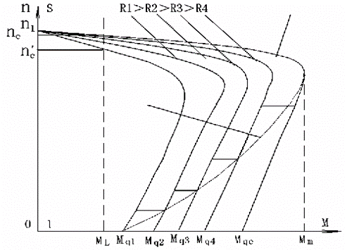 ?。?)圖中起動曲線與橫軸交叉點(Mq1、Mq2、Mq3、Mq4、Mqe)為起動初始電磁轉(zhuǎn)矩。ML為額定負載轉(zhuǎn)矩,對應(yīng)的轉(zhuǎn)速為電機額定轉(zhuǎn)速(Ne)。Mm為最大電磁轉(zhuǎn)矩。