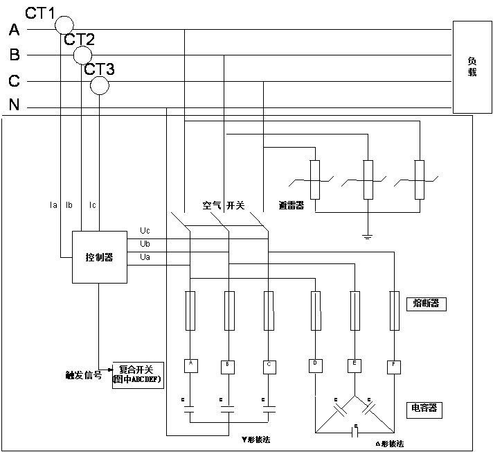 補(bǔ)償裝置主要由柜體、控制器、空氣開(kāi)關(guān)、避雷器、電容器、熔斷器和復(fù)合開(kāi)關(guān)等組成。其主電路圖如下(方框內(nèi)部是補(bǔ)償裝置主電路;方框外部是低壓配電網(wǎng)):