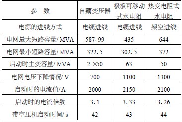 根據目前實際采集到的啟動曲線情況來看, 這3 種啟動方式都無特別明顯的優勢和特別大的區別, 3 種不同的啟動方式將電網的壓降值都控制在電網允許的范圍內, 啟動電流的倍數都控制在額定電流的3 倍左右, 啟動時間都控制在42~45 秒內。由于各地現場的情況不完全一致, 實際運行情況肯定受其他啟動因素的影響, 所以認為這3 種啟動方式都是大型電機比較理想的啟動方式, 其對電網產生的壓降大小除了和當地電網容量有很大關系外,和其上級主變壓器的容量也有密不可分的關系。采取不同的電機啟動方式啟動空壓機時的技術參數比較見表1 。